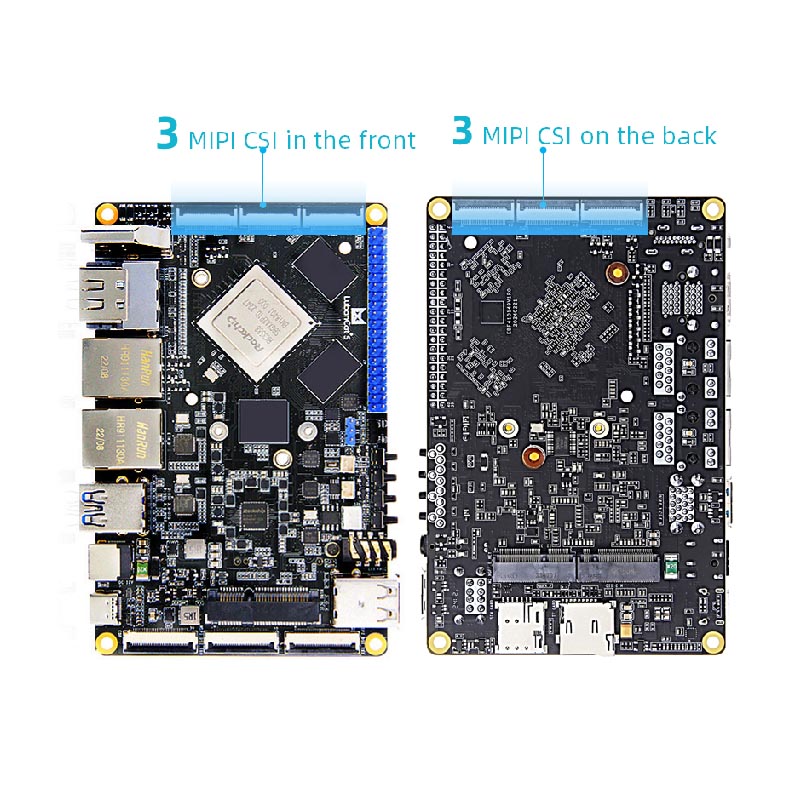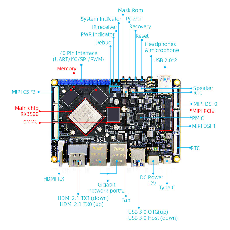 2. Используйте RockChip RK3588 в качестве основного чипа, используя 8-нм Advanced Process Technology, с самой высокой основной частотой до 2,4 ГГц, интегрирующей четырехъядерную 64-битную Cortex-A76 и четырехъядерный 64-битный Cortex-A55 для общего числа восьмилоговых процессоров и ARM MALI-G610 MC4GPU поддерживает 8K Video Enchoding и 8K. Он обладает возможностями обработки изображений, поддерживает многокамерные вводы, поддерживает многоэкранную дифференциальную дисплей и имеет встроенный независимый NPU для расширения возможностей различных сценариев ИИ.